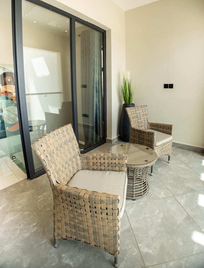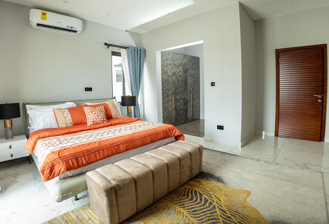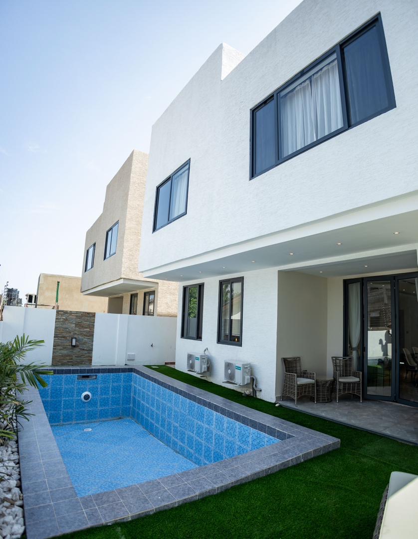fully furnished 3-bedroom, 1-storey house at East Legon Hills. It comes with a living room, dining Lounge, kitchen, backyard for relaxation, a staff quarters, a covered balcony in the master bedroom area, a security bay with a washroom, a visitor’s washroom on the ground floor and a swimming pool for relaxation.